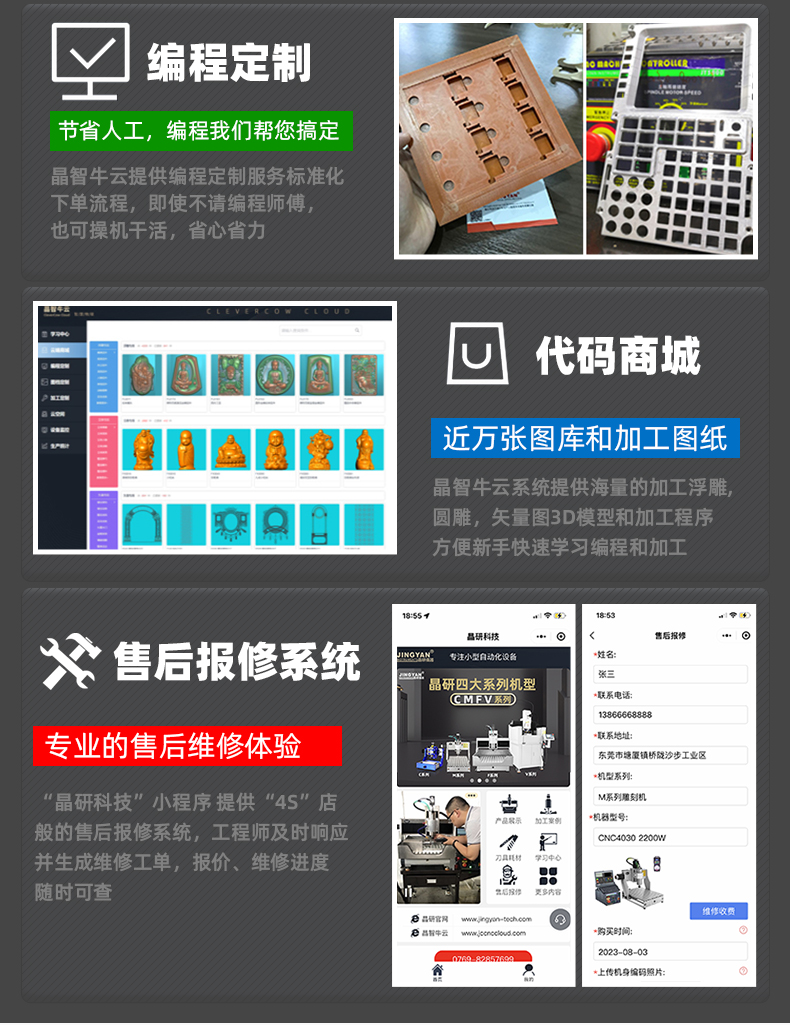 晶研M系列桌面雕刻機(jī)提供多種功率選擇,適應(yīng)不同硬度材料加工需求。其高精度編碼限位系統(tǒng)、高速閉環(huán)電機(jī)和智能驅(qū)動卡,確保了加工的精度、速度和節(jié)能效果。此外,晶智牛云系統(tǒng)和手機(jī)小程序?yàn)橛脩籼峁┝吮憬莸慕虒W(xué)和售后服務(wù),使其成為工業(yè)應(yīng)用的理想選擇。