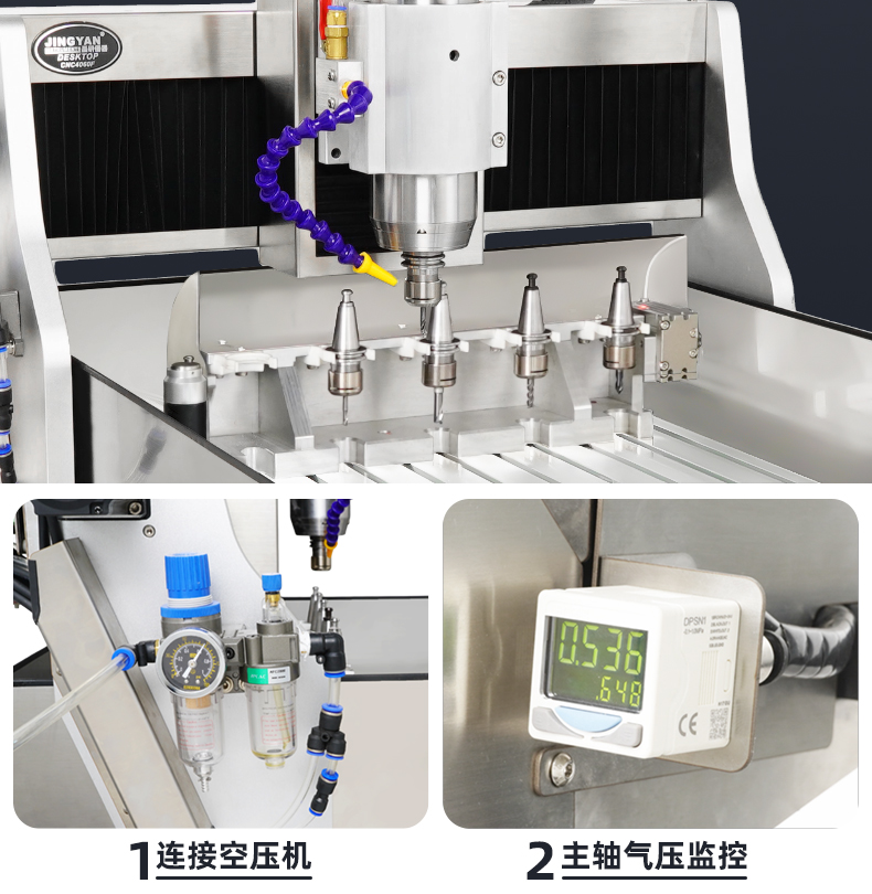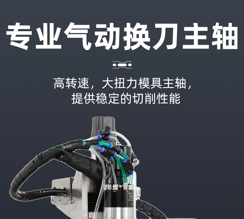 晶研F系列自動(dòng)換刀方軌精雕機(jī),專為高效多工序加工設(shè)計(jì),設(shè)備具備自動(dòng)換刀功能,提高加工效率,操作面板位于左側(cè),配有顯示屏和控制按鈕,機(jī)床頂部裝有主軸和刀具,用于執(zhí)行加工任務(wù),冷卻系統(tǒng)確保加工過(guò)程中溫度控制,黃色安全警示標(biāo)簽提醒操作安全,整體設(shè)計(jì)旨在提升生產(chǎn)效率和加工精度,適合精密制造領(lǐng)域使用。
