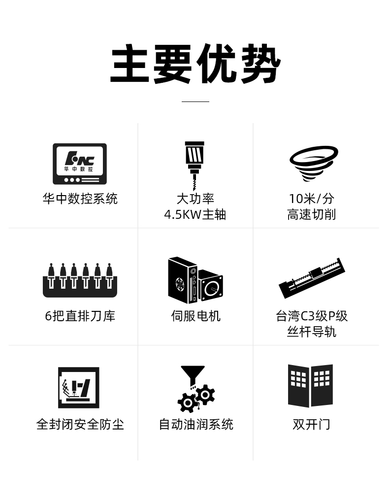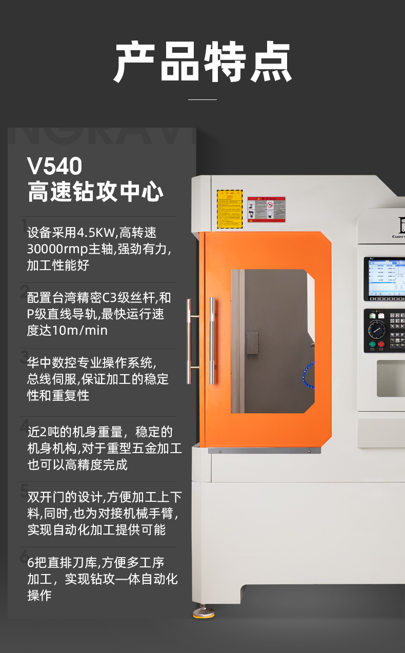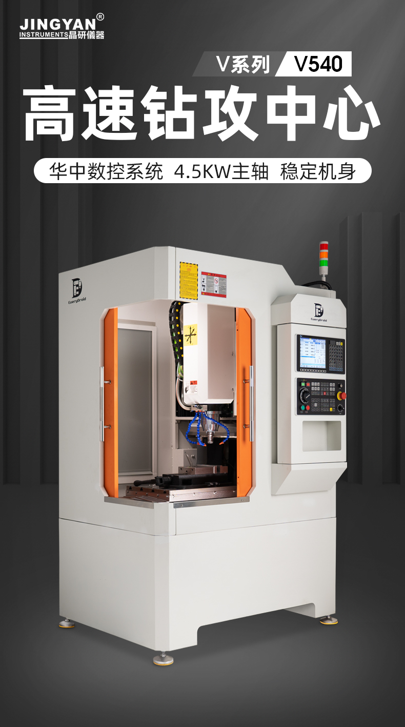 晶研V540高速鉆攻中心,采用4.5KW、30000rmp高轉(zhuǎn)速主軸,強勁有力,加工性能佳。配置臺灣C3級絲桿和P級直線導(dǎo)軌,最快運行速度達10m/min。搭載華中數(shù)控專業(yè)操作系統(tǒng),總線伺服,確保加工穩(wěn)定性和重復(fù)性。機身重近2噸,結(jié)構(gòu)穩(wěn)定,適配重型五金高精度加工。雙開門設(shè)計,便于上下料及對接機械手臂實現(xiàn)自動化。6把直排刀庫,支持鉆攻一體自動化操作。