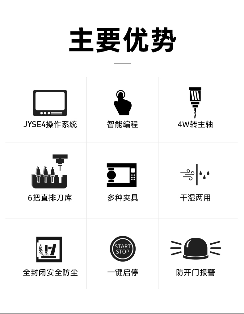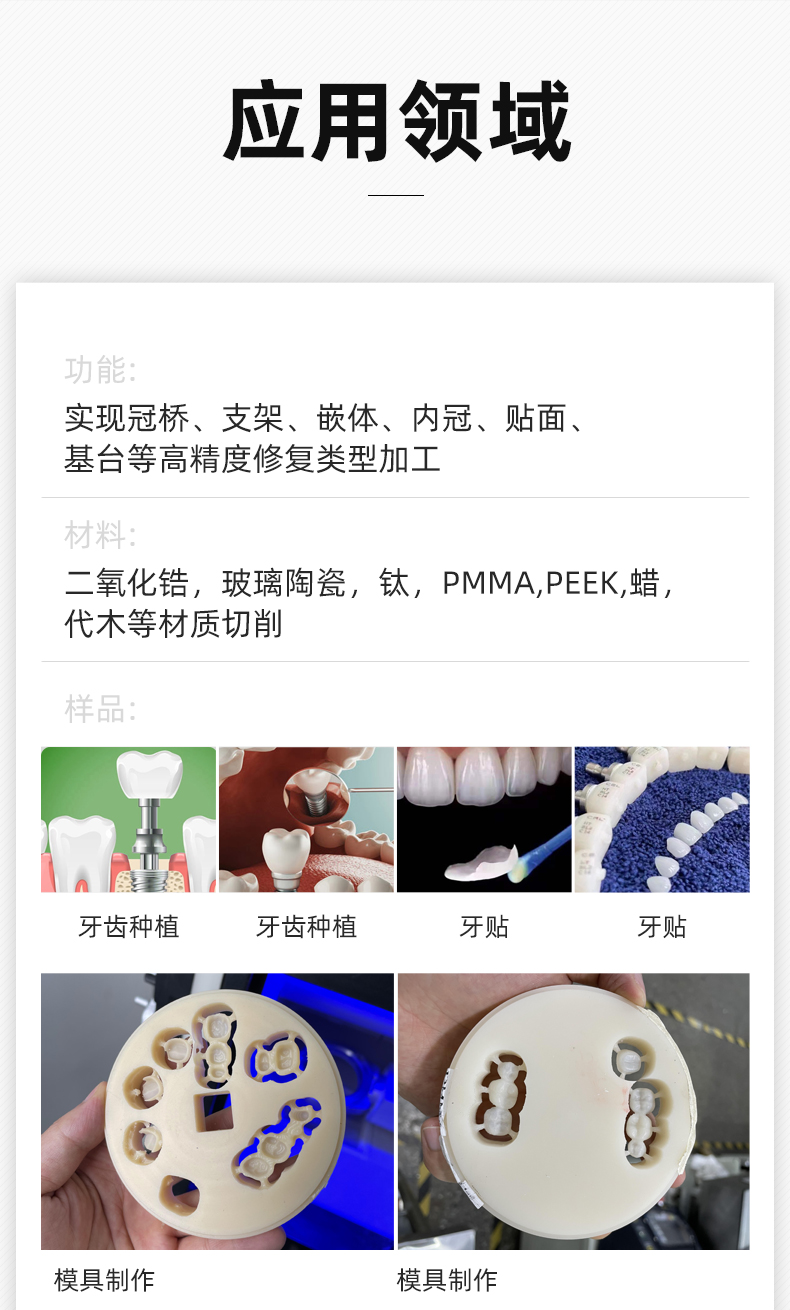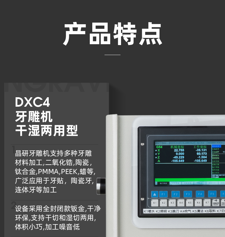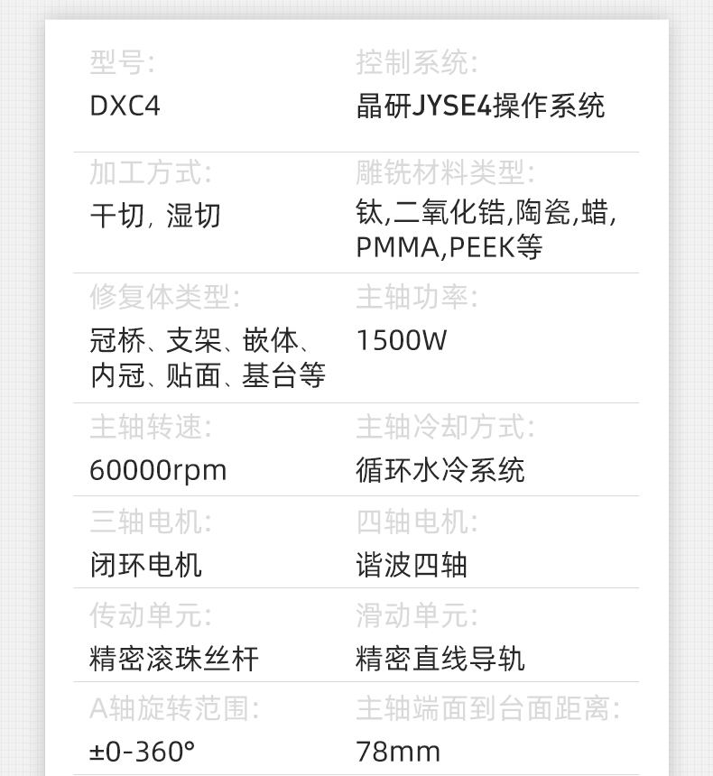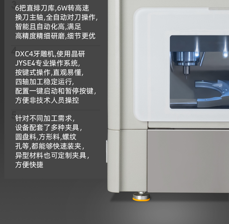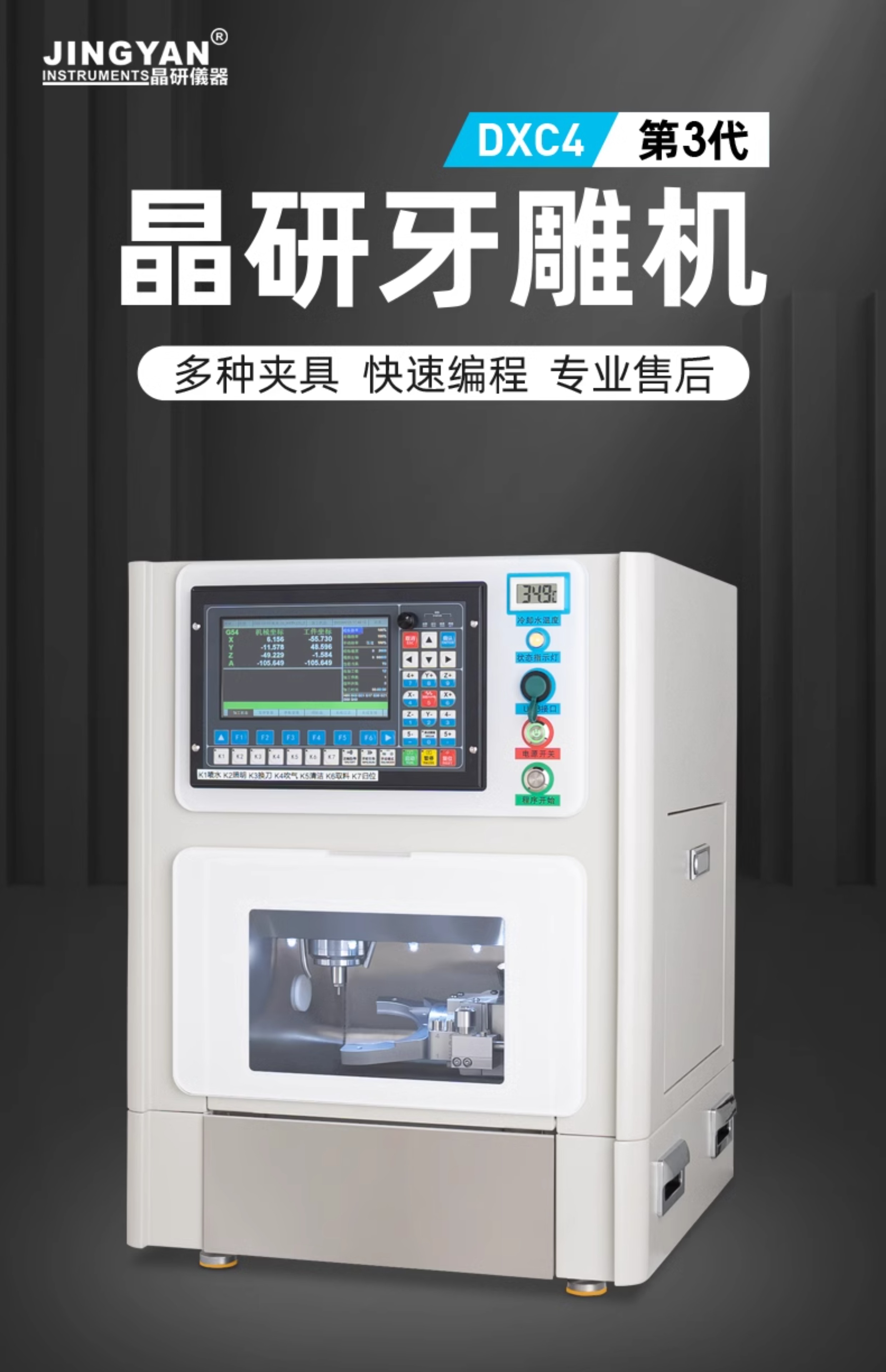 晶研DXC4牙雕機(jī),干濕兩用,支持二氧化鋯、陶瓷、鈦合金、PMMA、PEEK、蠟等多種材料加工,適用于牙貼、陶瓷牙、連體牙等。全封閉鈑金設(shè)計(jì),干凈環(huán)保,干濕切皆可,體積小巧,噪音低。6把直排刀庫(kù),6萬(wàn)轉(zhuǎn)高速主軸,全自動(dòng)對(duì)刀,高精度研磨細(xì)節(jié)佳。配備JYSE4系統(tǒng),按鍵操作簡(jiǎn)單,四軸加工穩(wěn)定,一鍵啟動(dòng)暫停,易上手。多種夾具適配,異型材料可定制,裝夾便捷。
