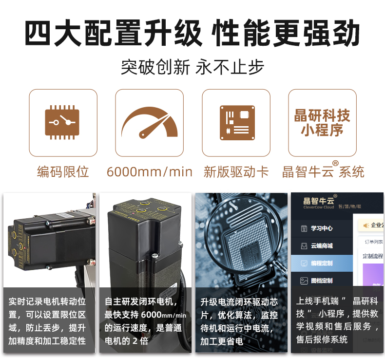 晶研M系列桌面雕刻機提供多種功率選擇,適應(yīng)不同硬度材料加工需求。其高精度編碼限位系統(tǒng)、高速閉環(huán)電機和智能驅(qū)動卡,確保了加工的精度、速度和節(jié)能效果。此外,晶智牛云系統(tǒng)和手機小程序為用戶提供了便捷的教學和售后服務(wù),使其成為工業(yè)應(yīng)用的理想選擇。
