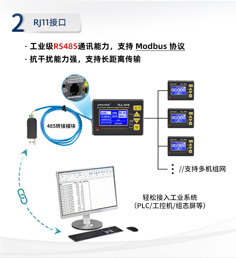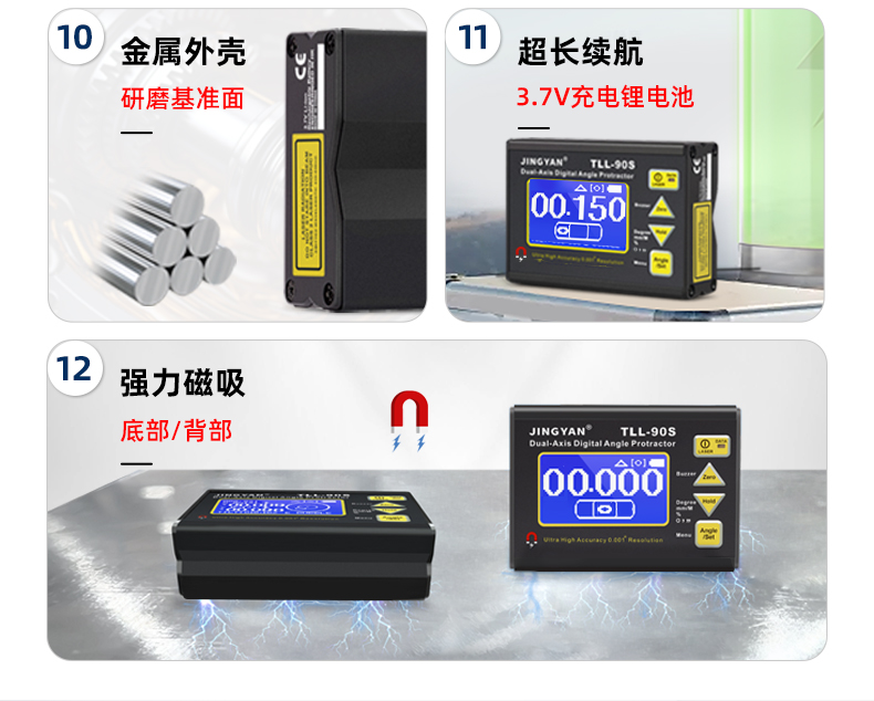 TLL-90S是一款專業(yè)測量水平傾角和空間相對夾角的高精度數(shù)顯傾角儀/水平儀,它基于微機電系統(tǒng)(MEMS)的先進技術(shù),結(jié)合優(yōu)化的補償模型算法,保證傾角儀測量的穩(wěn)定性和重復(fù)性,實現(xiàn)最好精度0.005°,分辨率0.001°,支持單軸4*90°,雙軸±40°測量。儀器可以采用4種測量單位顯示(角度、毫米/米、斜率、度分秒),底部和背部測量基準面有強磁性,V型凹槽設(shè)計便于放置在圓管上進行測量。地線激光功能方便產(chǎn)品打標線。新穎的空間相對夾角功能(GYRO),可以不受環(huán)境限制,測量任意平面之間相對夾角,陀螺儀測量精度±0.5°。三重數(shù)據(jù)存儲功能,連接電腦或手機數(shù)據(jù)傳輸,支持485 Modbus協(xié)議通訊。TLL-90S廣泛應(yīng)用于基建工程,航空實驗,醫(yī)療械,機械制造,科研測試等用途。TLL-90S以其豐富的功能和可靠性,廣受全球客戶青睞。