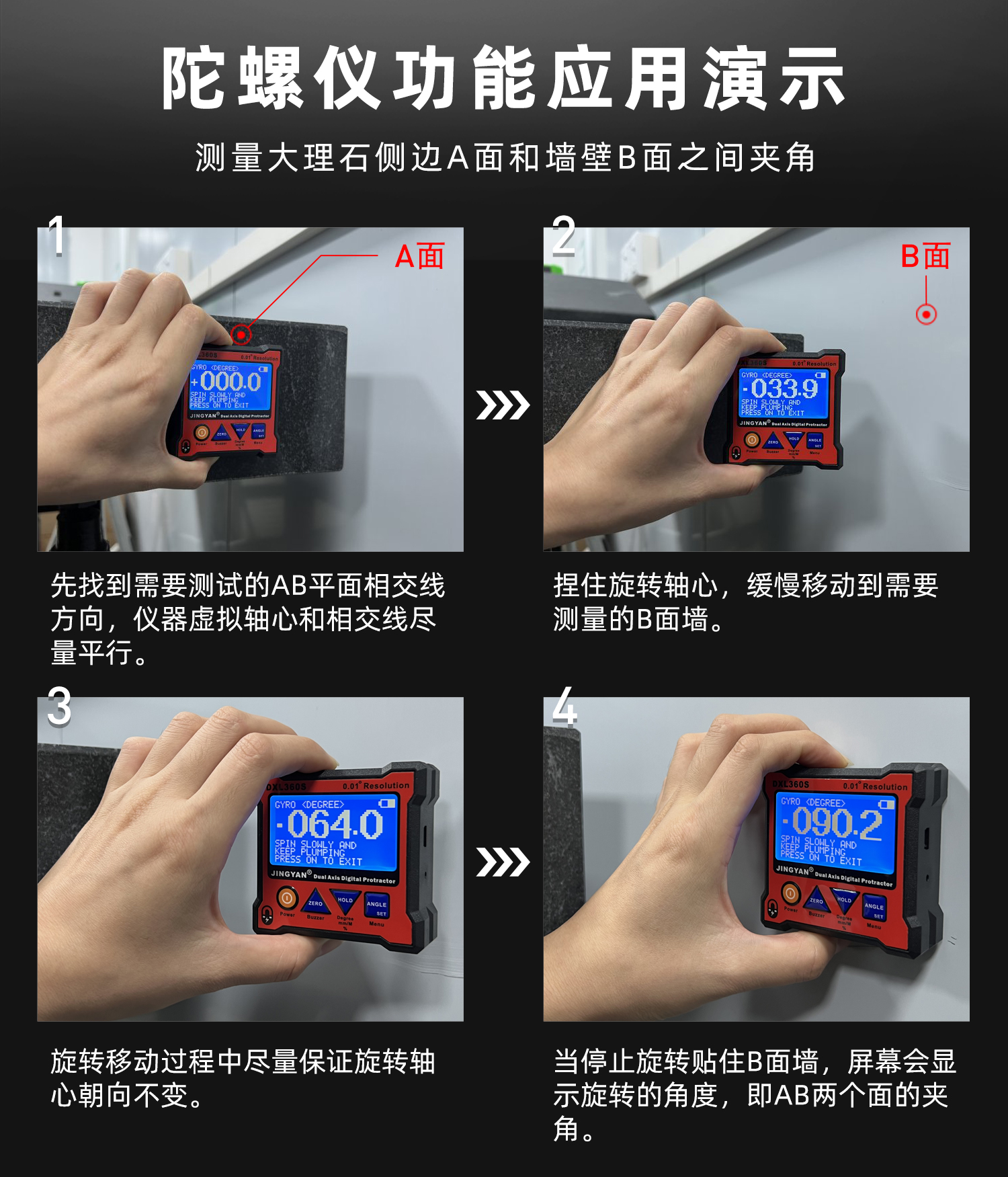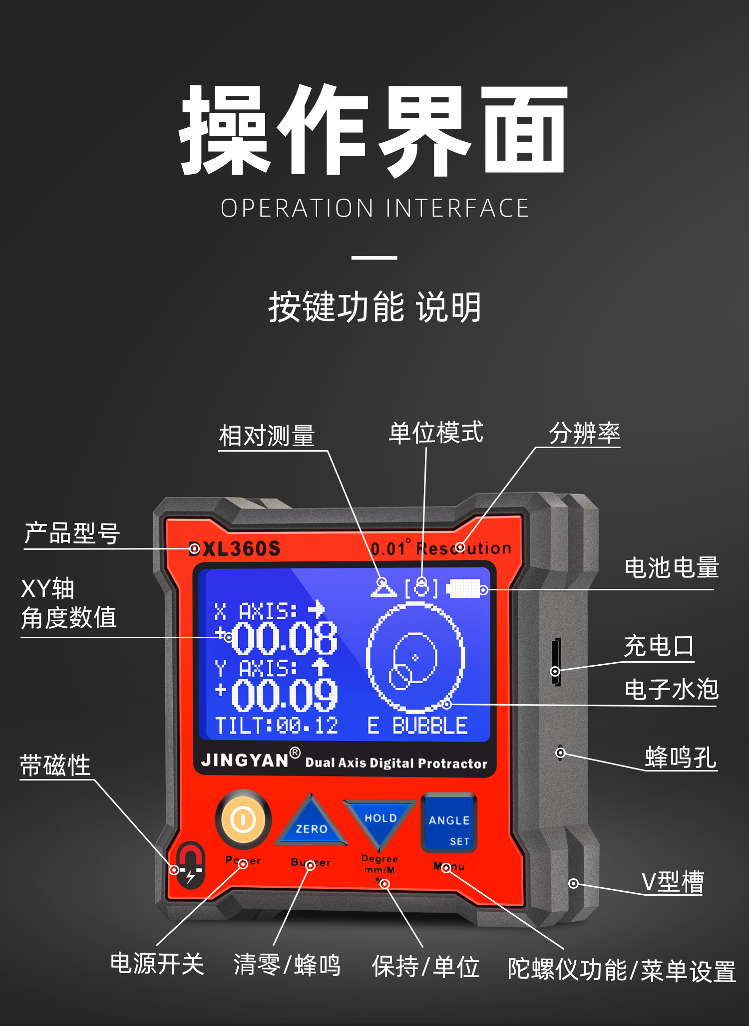 DXL360/S是一款專業(yè)測量水平和空間相對夾角(*DXL360S專有)的高精度數顯傾角儀/水平儀,它基于微機電系統(tǒng)(MEMS)的先進技術,結合優(yōu)化的補償模型算法,保證傾角儀測量的穩(wěn)定性和重復性。DXL360S精度高達0.05°,分辨率0.01°,可以采用3種測量單位顯示(角度、毫米/米、斜率),特有的空間相對夾角功能(GYRO),可不受環(huán)境限制,測量任意平面之間相對夾角,陀螺儀測量精度±0.5°。DXL360實現最好精度0.1°,分辨率0.02°,可以采用2種測量單位顯示(角度、毫米/米)。DXL360/S支持單軸4×90°,雙軸±40°測量,底部和背部測量基準面有強磁性,V型凹槽設計便于放置在圓管上進行測量。雙重數據存儲功能,連接電腦或手機進行數據傳輸。DXL360/S廣泛應用于機械制造、汽車維修、醫(yī)療行業(yè)、木材加工、通訊檢測、家居裝潢等用途。DXL360/S以其豐富的功能和實用性,廣受全球客戶青睞。
