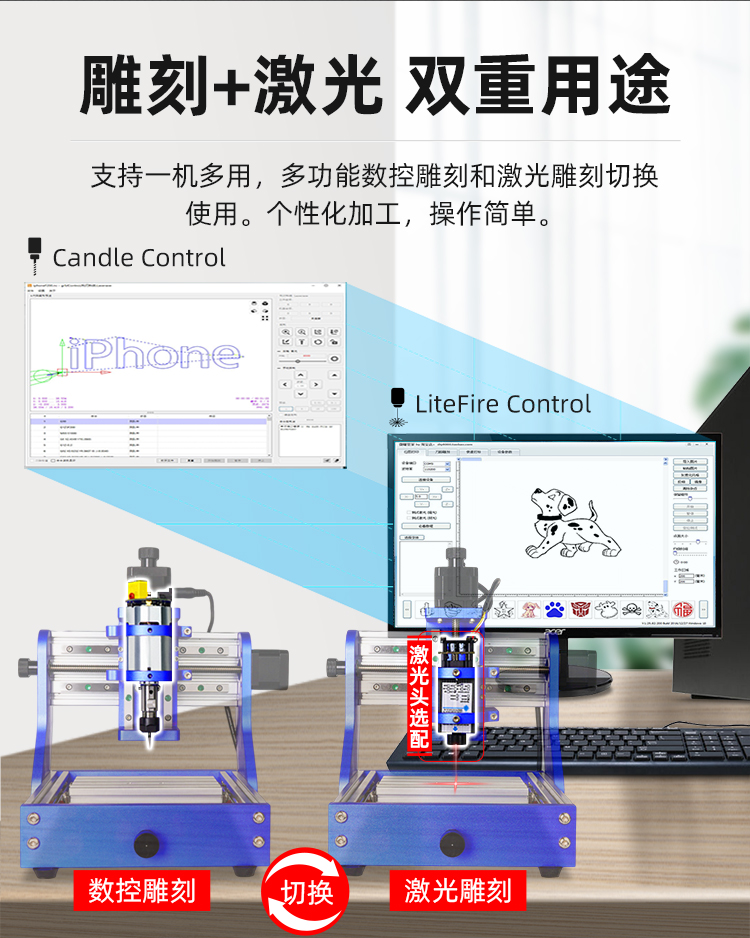 迷你雕刻機(jī)支持一機(jī)多用,多功能數(shù)控雕刻和激光雕刻切換使用,個(gè)性化加工、操作簡(jiǎn)單。無(wú)需安裝控制軟件,登錄晶智牛云平臺(tái)頁(yè)面,即可通過(guò)網(wǎng)頁(yè)端自帶“晶智牛云系統(tǒng)”控制機(jī)